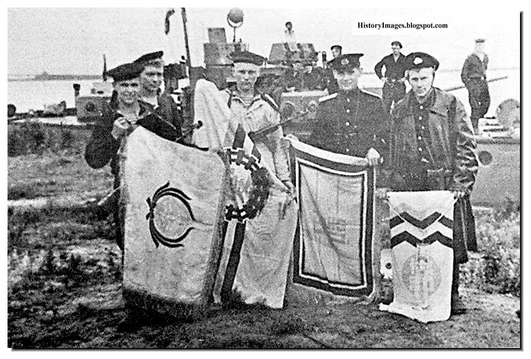 The caption reads: "Russian sailors with captured Japanese flags." There is no other information regarding the photograph, except that the page context is Operation August Storm, the Soviet operation against Japan's mainland conquests, directly following the destruction of Hiroshima in August of 1945.