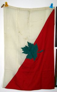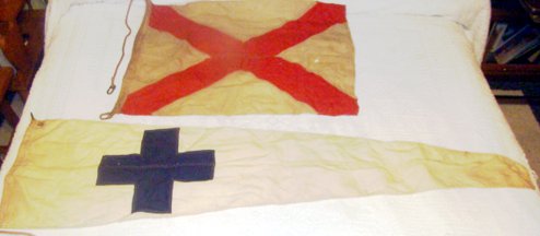 I recently purchased a trunk at an auction that contained World War II U.S. Naval uniforms and there were two flags in the bottom of the trunk. It appears that one of them (White with a blue cross) has a Japanese symbol in one corner. The other flag is square with a red cross no markings. My question is can you tell me what the symbol on the pennant means, what type of flag ?