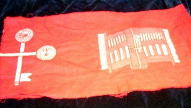 I was hoping you could help me identify this pennant? It is approximately 19 1/2" long x 11 1/2" tall and is sewn together from different sections of cloth. Any information would be greatly appreciated.