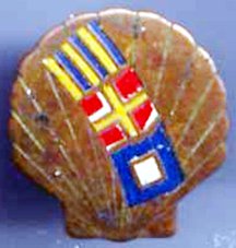 Although the pin is obviously a scallop shell, I would be surprised if it is a Shell Oil Fleet Pin - I would expect them to use the Shell Oil colours, yellow and red. The scallop is also used in heraldry and does appear on some flags. Its best known use is in connection with the Camino de Santiago, Spain. The C letters are correctly identified.