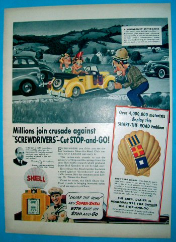 The shell does represent Shell Oil, and the signal flags "GRP" are the old signal code for "Give Way". This is a license-plate ornament that was given out by Shell dealers as part of an advertising campaign to promote courteous driving habits.