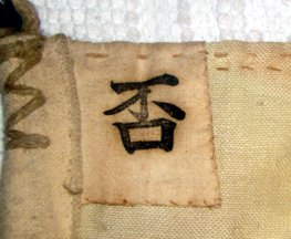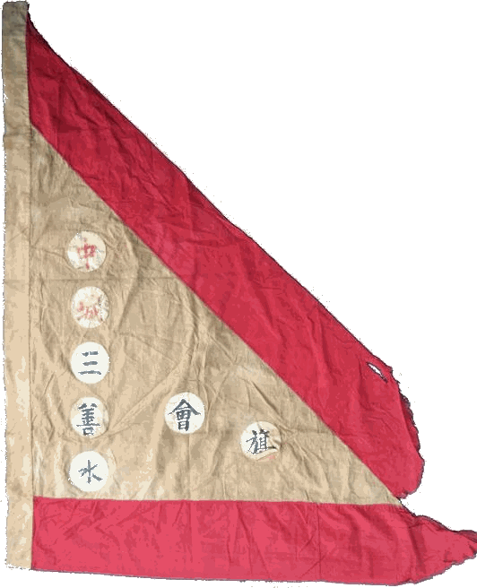 - Second from the viewer's right; I'm tempted to say this one is held the wrong way as well, as the character would seem to read best from the viewer's right. It's still unreadable because of the folds, though. Comparing with the other flags, I'd go for blue thick border, than white then black inner border, with a mustard yellow field and red character. The blue and red aren't all that certain, though.