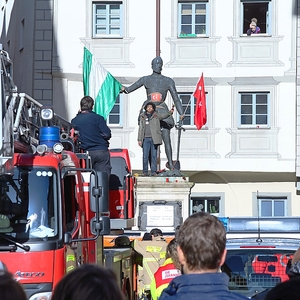 It looks like the flag is on the statue itself, the protester has a the Turkish flag, but his other arm is down and empty. And the green-white-green horizontal is larger too. Looks like it is regularly part of the statue, but this is a guess.