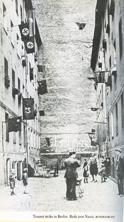 I recently bought a book called "Adolf Hiter" by John Toland (ISBN: 0385037244), and while flipping through the pages I came across some German Flags which I think are German. One Flag (very top on left side) seems to be a Hammer and Sickle which seems like a Soviet Version, but then again it might just be a Communist/Marxist Party flag. Two flags which seem to have a skull and maybe crossed bones?, at different positions on the flag. And lastly a flag which looks like the letter "M", but since it being hung from a window it looks more like the number 3. I couldn't find theses flag on the Third German Empire page or find anything similar to them. I am hoping that someone will identify these flags.