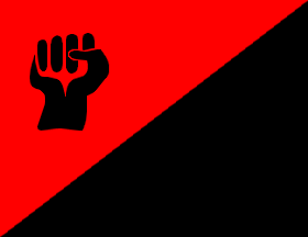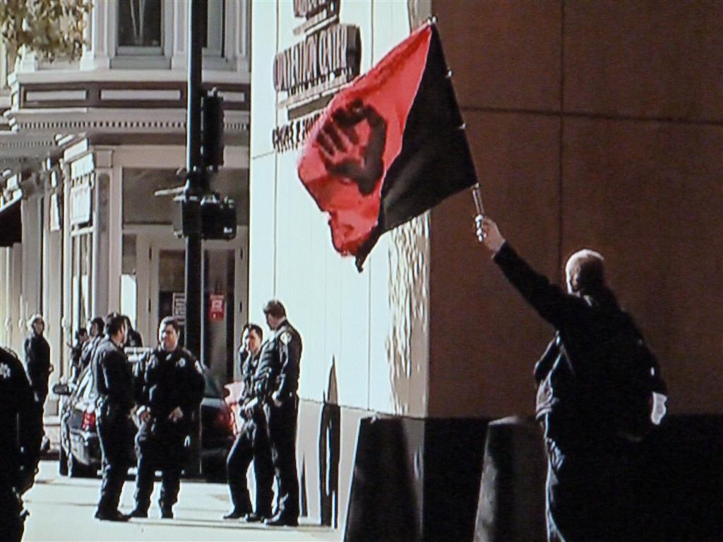 While watching the 6 O'clock News coverage (25 Oct 2013) of the newest Occupy sponsored (encouraged?) protest in Oakland, California, I spotted a strange flag being flown there. It appeared to be an Anarcho-Syndicalists Flag with the addition of a black power fist in the red diagonal stripe. The protester seemed to be waiving it at a group of uninterested Oakland police who were standing by as the protesters marched from the front of the Oakland Marriot Hotel to a nearby police station. The press has named the demonstration the "Urban Shield Protest" because apparently there is a police convention (seminar?) being held at the Marriot discussing the issue of urban protest and violence and ways to protect the public and it's property.