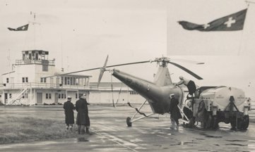 This is "corpen" or "course pennant", a Royal Navy signal flag in use until the NATO system was adopted in 1950. At sea it was used to signal the order to turn in succession, or wheel. On land it probably had a non-standard local meaning. The corpen may have been flown to indicate "gliding in progress". The symbol for this in airfield signal squares is a horizontal white bar with two small vertical cross bars. Split in two, this would be two white crosses. See Double White Cross. (Click on "Read more about the more modern Signal Area" at bottom of page for photograph.)