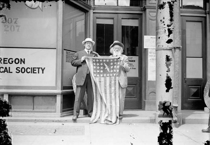 This picture was originally posted on Reddit. A Reddit editor posted this information about the picture. "The window and the pole say Oregon Historical Society. Oregon become a state in 1859, a few years before this flag was made. Based on the clothing the picture would be dated from about c1929. Thus the flag might have something to do with the 70th anniversary of Oregon's admission to the Union."