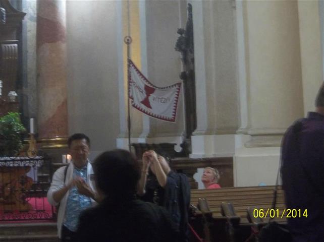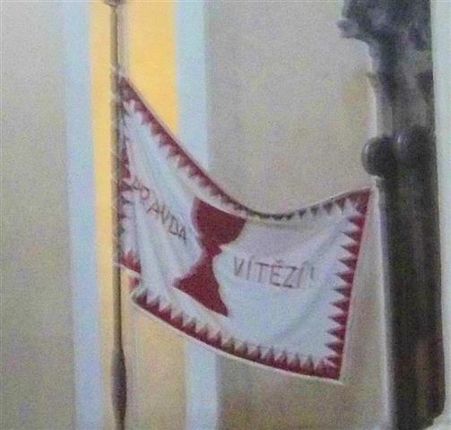 The wording on either side of the red chalice on the flag is PRAVDA VITEZI, which is Slovenian for "THE KNIGHTS OF JUSTICE." There is a humanitarian aid organization called "The Sovereign Order of the Knights of Justice" that works with the United Nations. They provide aid to the poor and the sick, support schools in poor countries, and help children and the elderly people in Europe, Asia, Africa and America. The Sovereign Order of the Knights of Justice is divided into a number of so-called Grand Priories, Priories, Commanderies and Delegations. They are commanded by Grand Priors, Priors, Commanders and Delegates. One such division is the "Commandery of Czech Republic." I'm not sure they have a flag, but perhaps this is it.