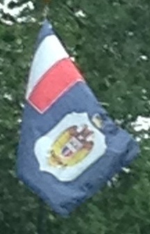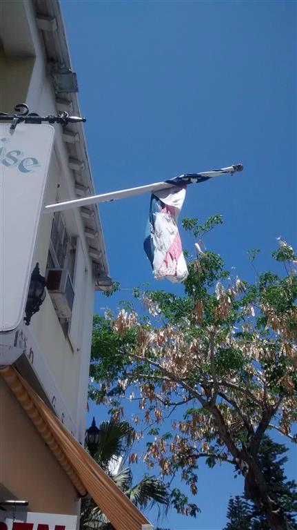 I am not sure what these flags are - at first I was going to say they look like decorative bunting, perhaps Brazilian and American, but then I noticed they had grommets so were meant to be hung like a flag, not draped decoratively.