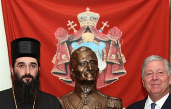 I found this photos of an event held in Russian cultural center in Belgrade two days ago. The gray haired person standing besides the bishop is HRH Prince Alexander Karageorgevich. The flag (#68a), however, hanging on the wall behind them is unknown to me. It resembles the flag of the patriarch of Serbian Orthodox Church. It has full coat of arms of SOC but placed on dark red field instead of Serbian tricolore with a white border with interlaced series of blue and red triangles. The flag is placed on the most prominent place during that event although the patriarch was not even present (hence the presence of the Bishop-vicarious Arsenios). Do you have any information about this flag?"
