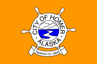 The flag of the City of Homer, Alaska, is yellow with white-blue version of the city seal on it. It can be seen here: