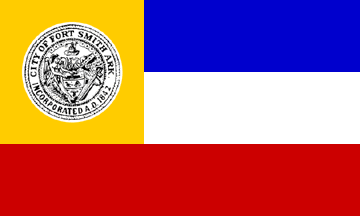 The city website is at www.fsark.com but seems to make no mention of the flag. The Fort Smith municipal flag is depicted on the NAVA U.S. cities flag survey. It consists of a blue-white-red tricolor, with a yellow square occupying the canton and covering the depth of the blue and white bands. On the yellow square is a blue-line version of the city seal.