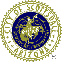 The website at www.scottsdaleaz.gov does not display any municipal heraldry. The logo simply consists of the words 'CITY OF SCOTTSDALE' in large dark gray capitals. To the left of these letters on a pale blue square that fades to white at the bottom is the outline form of a cowboy in slate gray riding a bucking bronco. His left arm is extended and grasps a sombrero, while both his hair and the horse itself are a dark slate gray. There is pale gray shading around the rear of the horse, creating a shadow effect. Beneath the last letters of the word 'SCOTTSDALE' is the word 'ARIZONA' in very small dark gray capitals.