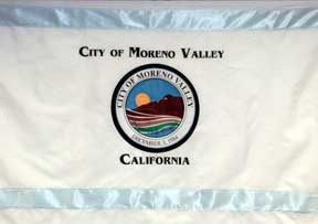 The City of Moreno Valley has a new flag. "This new flag was unveiled on the 21st birthday of the incorporation of the city (3rd December 2005). It replaces the flag that was ordered by the City's first Finance Director Ann Marie Gallant in 1989. The flag is a full color replica of the City Seal, approved by then City Council consisting of Patty Goodwin, J. David Horspool, Cynthia Crothers, Judy Nieburger and Denise Lanning. It has been stored and maintained by the City Council staff and since that time displayed for ceremonial purposes at the League of California Cities Conference and at a variety of City functions."