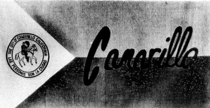 fields with "Camarillo" in white letters across the middle of the flag and black and white image of the city logo on the triangle. The logo shows Camarillo on a horseback and "THE CITY OF CAMARILLO CALIFORNIA/LAS PERSONAS SON LA CIUDAD" in circle around. Later the flag was modified when the letters where change from white to black. No information when this change took effect, but it might be in 1984. Nowadays, the logo is modified too, but I can't affirm that it is altered on the flag.