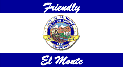 A 1:3:1 horizontal triband, blue-white-blue, with Friendly and El Monte written on the blue bands and the city seal on the white.