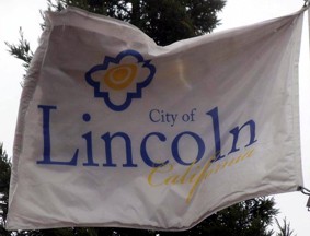 The flag is white with the city logo depicting the name in blue, California in yellow, and a geometric floral design in the upper hoist in blue and yellow.