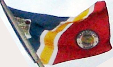 Diagonally divided per bend sinister, blue-yellow-red, the yellow band bordered white, with the seal(?) in the lower fly and another item in the upper hoist.