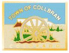 The flag depicts a scene of a wagon wheel in front of some vegetation and a campsite with the name arched above the campsite in the sky.