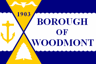a white tree. On the white stripe near the hoist, a yellow anchor; on the fly the words "BOROUGH OF WOODMONT".