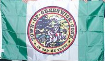 The flag is rectangular, vertically divided green-white-green with town seal in the center of the white stripe. It can be seen here: extras.mnginteractive.com/live/media/site8/2008/1122/20081122__winklevoss_300.jpg