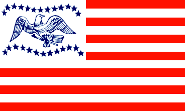 Utah was settled by Mormons and was made a territory in 1847. Since that time, a beehive has been one symbol (among others) used there. In 1851 the territory, under the name of Deseret, petitioned for admission to the union. They would not outlaw polygamy, and were turned down by Congress. Utah was admitted as a State in 1896. This flag was used apparently in 1851; at any rate, it appears in the Bellerophon Books coloring book entitled "American Flags to Color from Washington to Lincoln," which was authenticated by Whitney Smith.