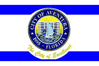 The Aventura city flag is the city logo on a white background with two narrow blue stripes near the top and bottom.
