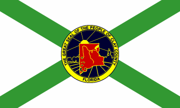 The flag is green saltire on a white background, with county seal (with altered colors) on the center of the saltire. It can be seen on a photo on Waymarking website: www.waymarking.com/waymarks/WM33CB_Clay_County_Fla_Fleming_Island_Fla.