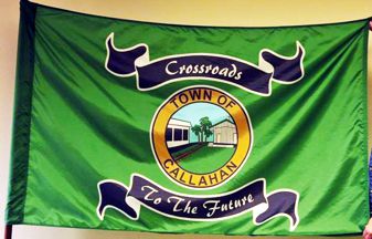 A green flag with the town seal on it, and black ribbons above and below with the town motto.