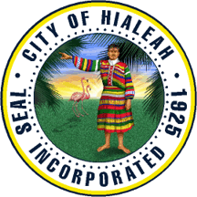 In www.hialeahfl.gov/multimedia/Intro.swf a slideshow at the official website, both the flag and the seal can be seen on actual, official use; the lettering is apparently not exactly like as shown in American Flag Survey (2004) and American City Flags. In www.hialeahfl.gov/images/photos/photo_Main02.jpg a photo at the main page of the official website, details are hardly visible but it further proves its actual use and recognition at an official level (and it is a nice flag photo, with the US national flag caught on a mosaic background patterned after itself). Yet another photo at www.hialeahfl.gov/