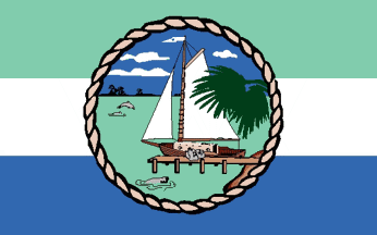 A horizontal tricolor, green-white-blue, with a rope-encircled central emblem showing a yacht by a pier.