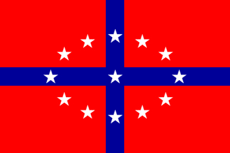The former flag was a ~3:5 red flag with a dark blue cross throughout and 13 white upright five-pointed stars (12 set in