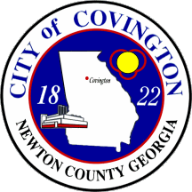 The flag of the City of Covington, Georgia, has a white background, dark-blue border, then another wider white border and then another red line border. In the middle is positioned city seal and "UNITED STATES OF AMERICA" in blue below the seal. Photo was send to me by the City Clerk Audra Gutierrez, who inform me that the flag was adopted at the May 17, 1993 council meeting.