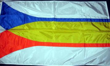 On a gray field, two horizontal and parallel horn-shaped devices, flared at the hoist, blue over orange, with the area between the horns in yellow. I do not have any idea what the symbolism is, and suspect it is a design from the 1970s or so.
