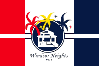 Arranged like the state flag, reversed, red-white-blue, with a white line (edged black across the white field), superimposed by the emblem consisting of a blue disk with building on it, and three palm-tree-like objects, red, yellow and blue.