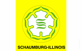 The flag of the Village of Schaumburg, Illinois, is yellow with village logo on it and "SCHAUMBURG-ILLINOIS" below it.