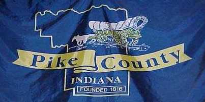 Image originally obtained from www.pcsc.k12.in.us (no longer available). On a blue field, an outline map of the county, overlain by a horse and wagon train, a ribbon bearing the words 'Pike County' and below the ribbon the word INDIANA, and in a box FOUNDED 1816.