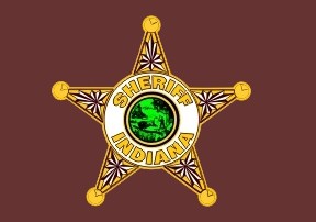 The flag is described as "Custom Outdoor Sheriff Flag. Brown with Indiana Sheriffs Association Logo silk screened in gold. brown and green. Flag reads correctly from both sides and is equipped with canvas heading and brass grommets.