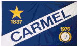 The flag is blue with a white rising diagonal bearing the name CARMEL. In the upper hoist is a large yellow star above the date 1837. In the lower fly is the city seal(?) with the date 1976 above it.