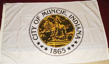 The flag is white with the seal centered in black and yellow, depicting an rider on horseback.