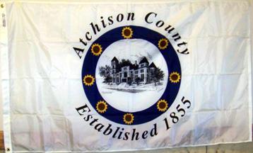 The flag of the Atchison County, Kansas, is white with county logo on it and "Atchison County" around above, and "Established 1855" around below. Photo of the flag thanks to Pauline M Lee, Atchison County Clerk.