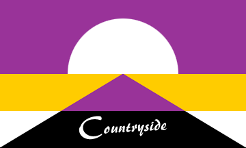 Rectangular flag of ratio approx. 3:5, divided horizontally in two equal parts: the upper one violet with a white half disc set on the lower edge, the lower half divided horizontally in two halves, dark yellow over white, with a triangle, also divided horizontally, violet over black triangle. The triangle is horizontally symmetrical, its base coinciding with the bottom of the flag and its apex with its center; the half disc being the upper half of an imaginary disc whose diameter is 2/3rds of the flag's height and whose center is the center of the flag. The whole composition is symmetrical except for the white lettering "Countryside" on the black area, set in a fantasy cursive "brush"
