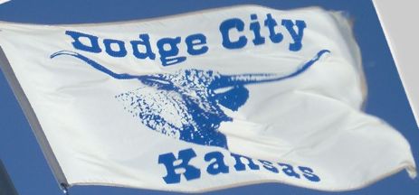 A white flag with the head of a longhorn steer. Above in an old west font 'Dodge City' and below in same font 'Kansas', all in blue.