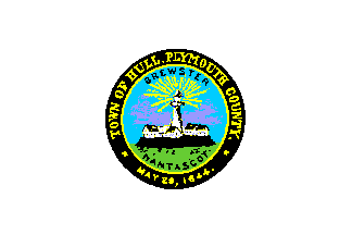 A white flag, containing the town seal, showing a lighthouse and the names BREWSTER and NANTARCOT above and below. The town and state names are written in yellow on a black ring around the seal. Hull is in Plymouth County.
