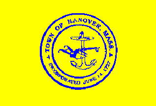 A yellow flag, containing the town seal at the center. The seal is a blue line drawing of a plow and anchor. The town and state names and date of incorporation are written around the edge. Hanover is in Plymouth County.