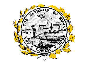 A white flag with a large city seal in the center. The seal features an urban factory scene, an outer ring with the city name and motto, and branches of yellow-leafed laurel and oak around it. Lowell is in Middlesex County.