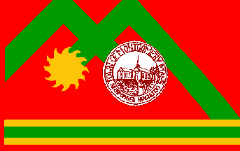 A distinctive red flag, with a lower yellow-green-yellow bar, two inverted green chevrons, presumably representing hills, a sun, and the town shield near the center. The town name is written across the top, and state name across the bottom. Montgomery is in Hampden County.