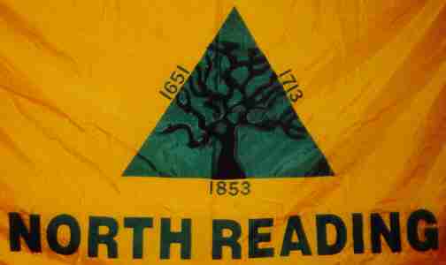 A yellow flag with a large green triangle in the center, bearing a multi-branched tree, and dates around the perimeter. The town name is written below in green. North Reading is in Middlesex County.