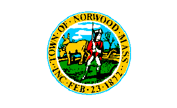 A white flag, with the city seal in the center. The seal consists of soldier guarding two oxen, and town name and date of incorporation in a ring around it. Norwood is in Norfolk County.