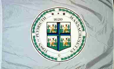 A white flag, with the town seal in the center. The seal consists of a shield quartered by a black-blue-light blue-green edging, showing in each quarter a kneeling native in front to two trees. The town and state names are inscribed on a white ring around the shield and outside that are leafy branches. Plymouth is in Plymouth County.